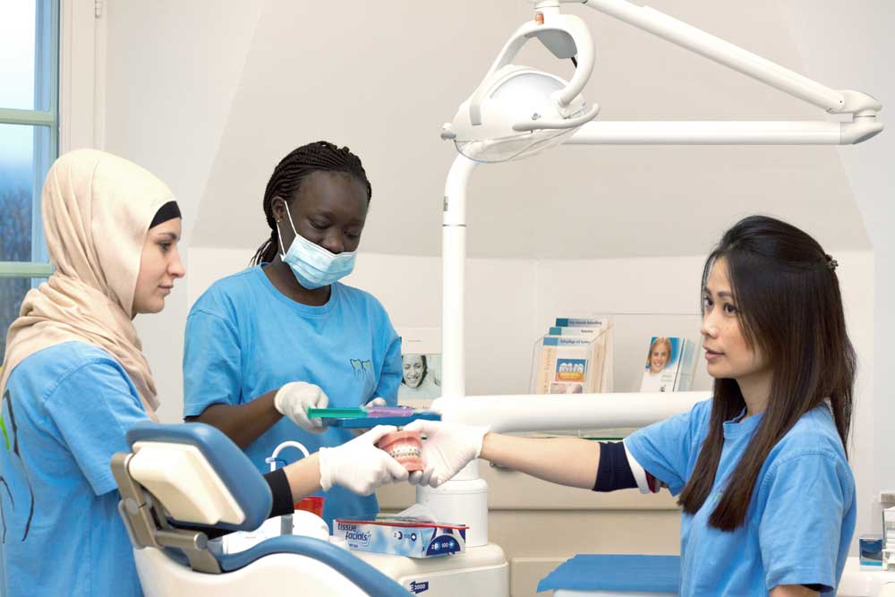 Unsere Praxis ist sehr international, auch meine zwei Kollegen haben ihre Großeltern in Skandinavien und Italien, und die ganzen Helferinnen und Auszubildenden kommen aus der ganzen Welt: von Thailand bis zu Afrika. Auch ihre Sprachkenntnisse sind sehr hilfreich, weil ja auch die Patienten nicht nur Deutsche sind. Es kommen Menschen aus allen Ländern, oft sind sie erst frisch hergekommen. Es gibt übrigens immer mehr ausländische Zahnärzte – vor allem aus Griechenland – wegen der Krise. Eigentlich bevorzugen sie wegen der besseren Berufsmöglichkeiten und des Gehalts in der Schweiz zu arbeiten, so wie es auch viele deutsche Zahnärzte tun.